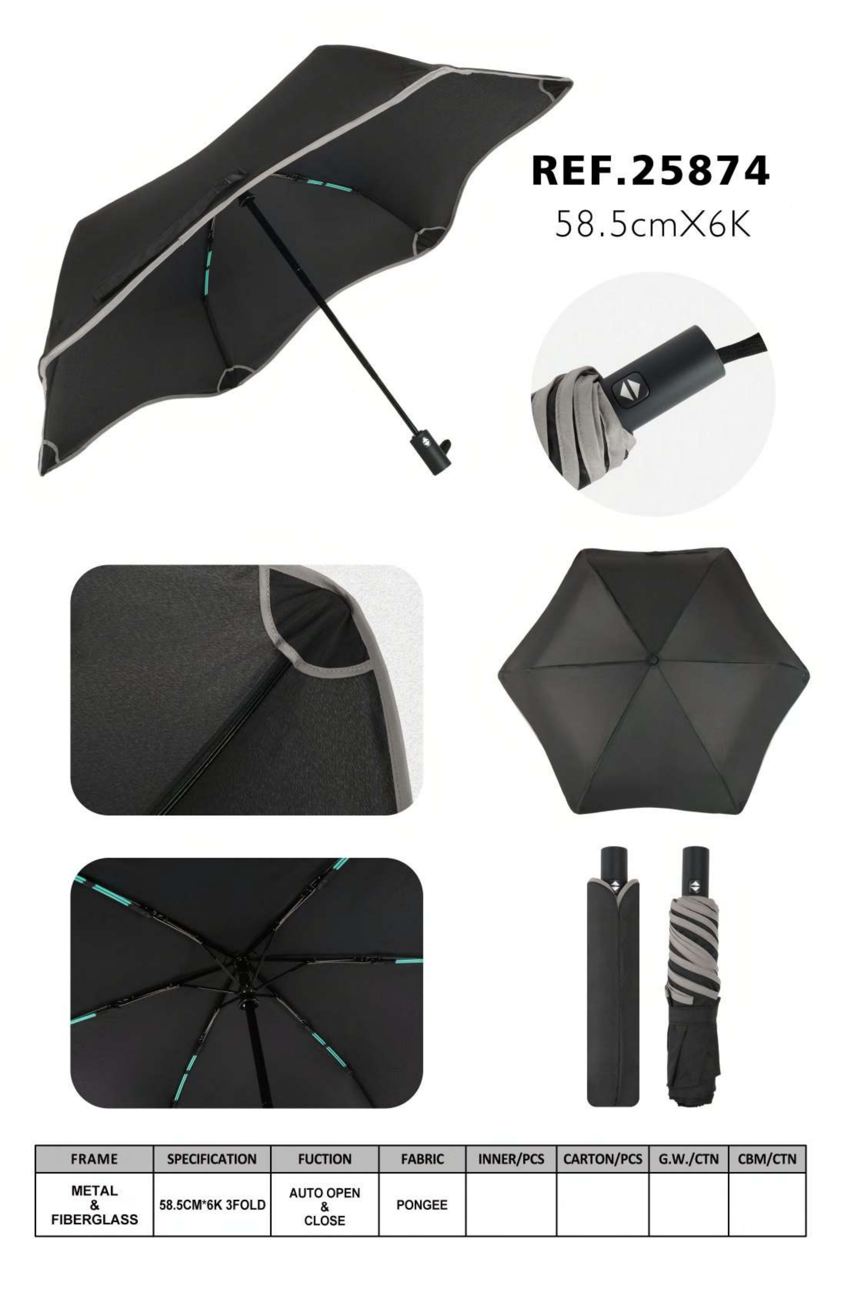 Engineered for safety, the SafeTail 25874 features an innovative upward-curved tail edge that prevents accidental poking. Its 58.5cm canopy with 6 panels and auto open/close mechanism offers convenient rain protection, while the metal and fiberglass frame ensures durability. The sleek gray design with subtle green accents combines practicality with modern style.